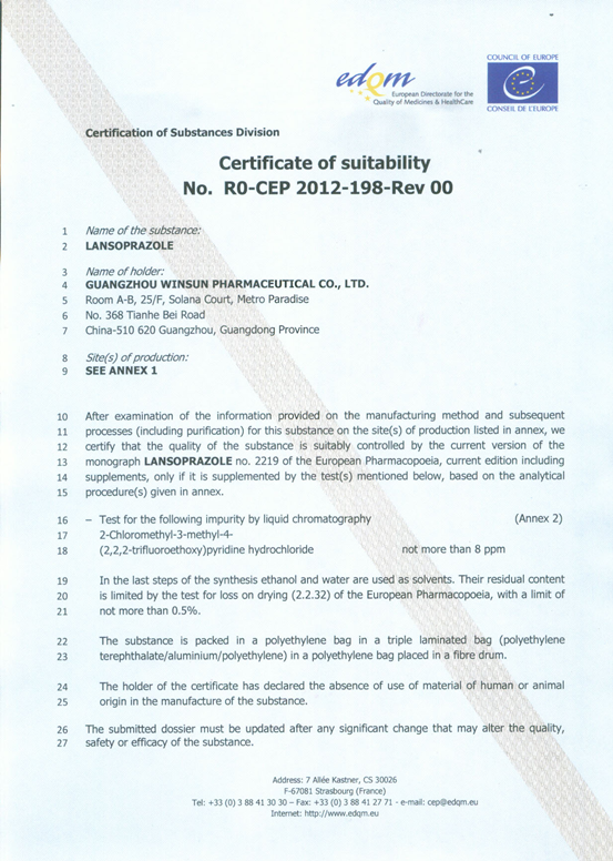 經過不懈的努力,華信制藥的產品——蘭索拉唑原料在2014年4月獲得EDQM頒發的CEP證書,這是我們的里程碑,是我們的產品進入歐美等高端市場的第一步,使我們更有信心將產品不斷的推向國外高端市場。