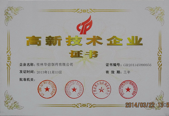 2014年3月,桂林華信制藥有限公司獲得國(guó)家級(jí)高新技術(shù)企業(yè)認(rèn)定證書(shū)和牌匾,我們是靈川縣第一家獲得高新技術(shù)企業(yè)認(rèn)定的生產(chǎn)廠家,充分說(shuō)明了我公司的研發(fā)水平和管理水平又上了更高的一個(gè)臺(tái)階,為公司今后的快速發(fā)展提供了更好的平臺(tái)。